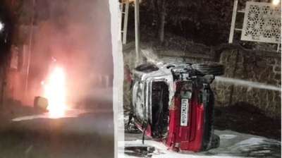 खंभे से टकराकर पलटी तेज रफ्तार कार में लग गई आग, बाल-बाल बचे आधा दर्जन सवार