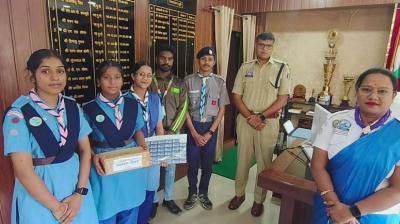 स्थापना दिवस के अवसर पर स्काउट्स, गाइड्स ने गणमान्यजनों को लगाया फ्लैग स्टीकर