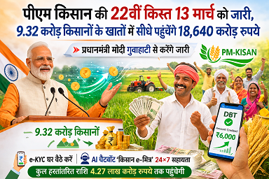 केंद्र सरकार शुक्रवार, 13 मार्च को देश के करोड़ों किसानों को बड़ी आर्थिक राहत देने जा रही है। प्रधानमंत्री नरेंद्र मोदी असम के गुवाहाटी से प्रधानमंत्री किसान सम्मान निधि (पीएम-किसान) योजना की 22वीं किस्त जारी करेंगे, जिसके तहत 9.32 करोड़ से अधिक किसान परिवारों के बैंक खातों में 18,640 करोड़ रुपये से अधिक की राशि सीधे डीबीटी के माध्यम से हस्तांतरित की जाएगी।