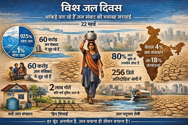 हर वर्ष 22 मार्च को विश्व जल दिवस मनाया जाता है, जो हमें यह स्मरण कराता है कि जल केवल एक प्राकृतिक संसाधन नहीं, बल्कि जीवन का मूल आधार है। पृथ्वी का लगभग 71 प्रतिशत भाग जल से आच्छादित है, किंतु इसमें से करीब 97.5 प्रतिशत जल खारा है और मानव उपयोग के लिए उपयुक्त नहीं है। मात्र 2.5 प्रतिशत मीठा जल उपलब्ध है, जिसमें से भी लगभग 68 प्रतिशत ग्लेशियरों और बर्फ में तथा करीब 30 प्रतिशत भूजल के रूप में सुरक्षित है। वास्तविकता यह है कि मानव उपयोग के लिए उपलब्ध जल कुल जल का 1 प्रतिशत से भी कम है। भारत जैसे देश के लिए यह स्थिति और भी चुनौतीपूर्ण है, क्योंकि विश्व की लगभग 18 प्रतिशत आबादी यहां निवास करती है, जबकि जल संसाधनों में इसकी हिस्सेदारी केवल 4 प्रतिशत है।