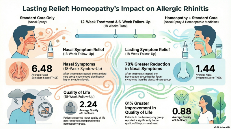 The results showed that during the active treatment period (at 4 and 12 weeks), both groups experienced similar improvement in nasal symptoms. At 18 weeks, patients who received homeopathy in addition to standard care demonstrated significantly better sustained outcomes. The Total Nasal Symptom Score (TNSS) was 1.44 in the homeopathy group compared to 6.48 in the standard-care-only group, representing an approximately 78% better reduction in nasal symptoms compared to standard-care-only group. Similarly, quality of life was markedly better in the homeopathy group (0.88) compared to the standard-care group (2.24), indicating a 61% improvement. This study has been published in a prestigious international journal.