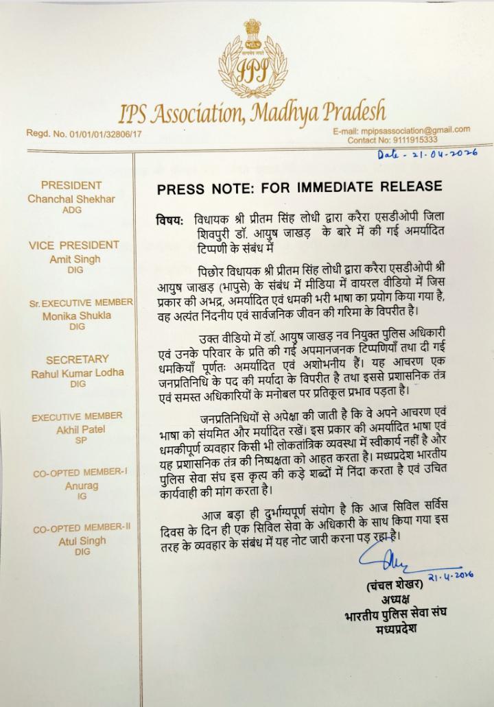 भोपाल, 21 अप्रैल 2026। मध्यप्रदेश आईपीएस एसोसिएशन ने पिछोर विधायक प्रीतम सिंह लोधी द्वारा करैरा एसडीओपी डॉ. आयुष जाखड़ के संबंध में की गई कथित आपत्तिजनक टिप्पणी पर कड़ी प्रतिक्रिया व्यक्त की है। एसोसिएशन ने इस मामले में प्रेस नोट जारी कर इसे निंदनीय और सार्वजनिक जीवन की गरिमा के विपरीत बताया है। जारी प्रेस नोट के अनुसार, विधायक लोधी का एक वीडियो सोशल मीडिया पर वायरल हुआ है, जिसमें उन्होंने एसडीओपी डॉ. आयुष जाखड़ के प्रति अमर्यादित भाषा का प्रयोग किया है। एसोसिएशन का कहना है कि इस तरह की भाषा न केवल एक पुलिस अधिकारी का अपमान है, बल्कि उनके परिवार के प्रति भी अनुचित टिप्पणी की गई है, जो पूरी तरह अस्वीकार्य है।