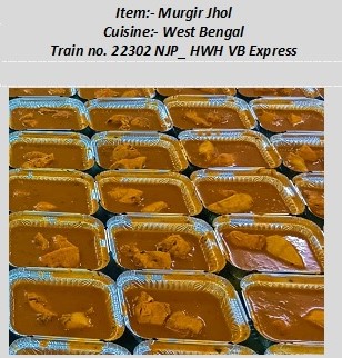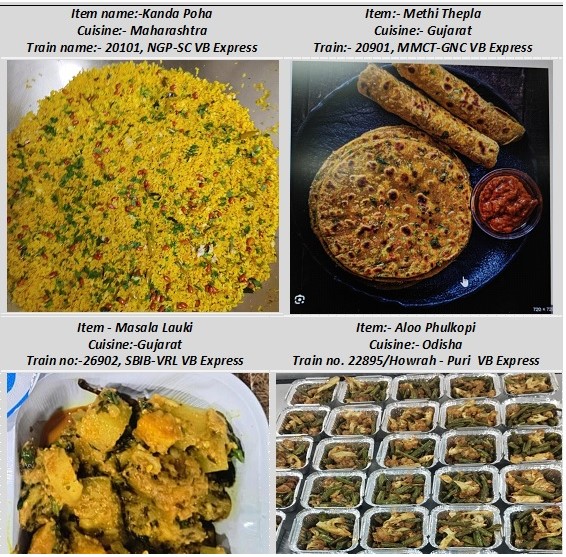 महाराष्ट्र का मसाला उपमा 22229 सीएसएमटी-एमएओ वंदे भारत एक्सप्रेस में उपलब्ध है, जबकि पश्चिम बंगाल का मुर्गिर झोल 22302 एनजेपी-एचडब्ल्यूएच वंदे भारत एक्सप्रेस में परोसा जा रहा है।