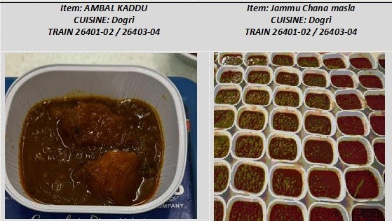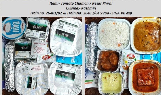 अंबल कद्दू और जम्मू चना मसाला सहित डोगरी व्यंजन रेलगाडी 26401-02 और 26403-04 में परोसे जा रहे हैं, और टमाटर चमन और केसर फिरनी आदि कश्मीरी व्यंजन रेलगाड़ी 26401/02 और 26403/04 एसवीडीके-सिना वंदे भारत एक्सप्रेस में परोसी जा रही हैं।